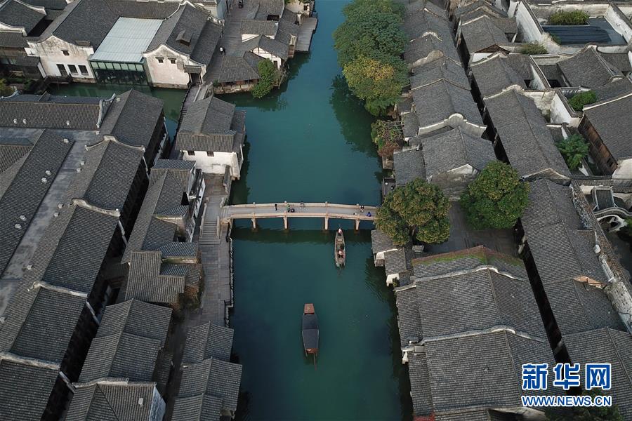 10月18日,游船行駛在烏鎮(zhèn)水道上(無(wú)人機(jī)拍攝)。新華社記者翁忻旸攝