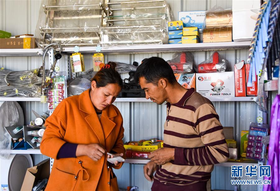 在位于澤普縣桐安鄉(xiāng)的建材鋪里,熱娜古麗·喀爾曼(左)跟前來購買建材的顧客交談(10月28日攝)。 新華社記者 關俏俏 攝