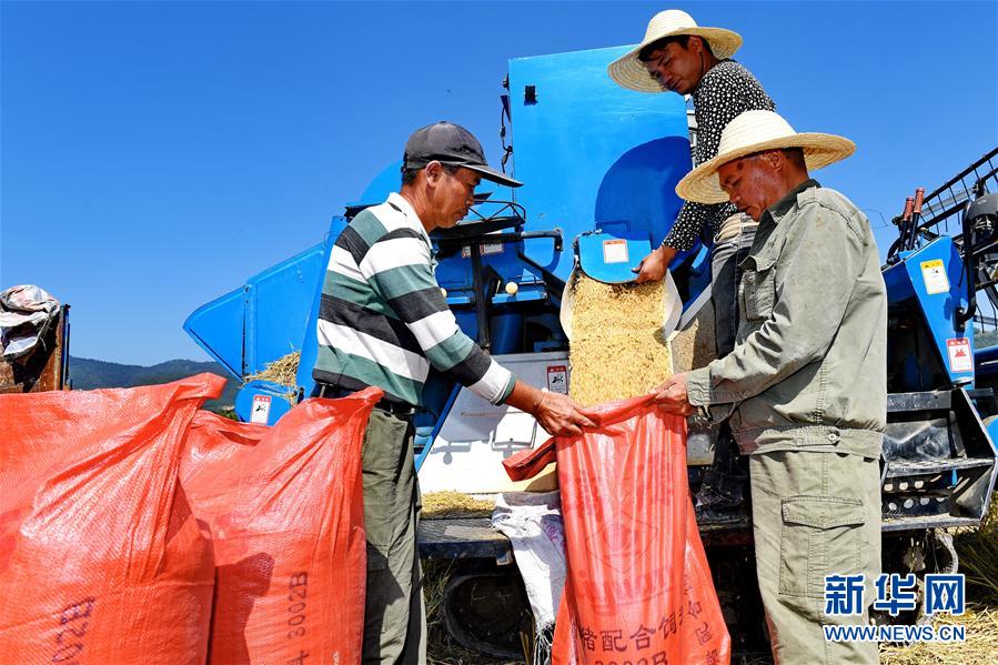 10月31日,武夷山市興田鎮(zhèn)南岸村農(nóng)民在裝運(yùn)稻谷。 新華社記者 張國俊 攝