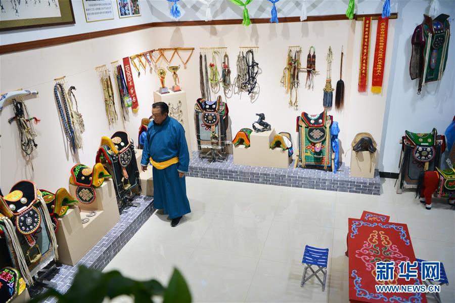 10月31日,在內蒙古自治區(qū)通遼市市區(qū),套格敦白乙走過工作室一樓的展廳。新華社記者鄒予攝
