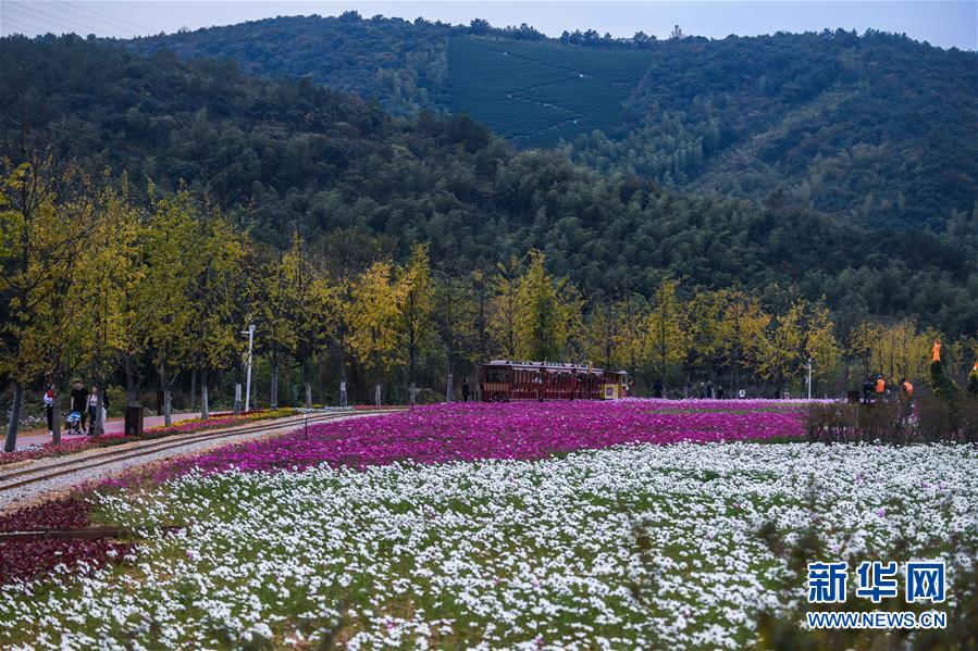 11月2日,游客在金黃的銀杏林與“五彩花?!遍g觀賞秋色。 新華社記者 徐昱 攝