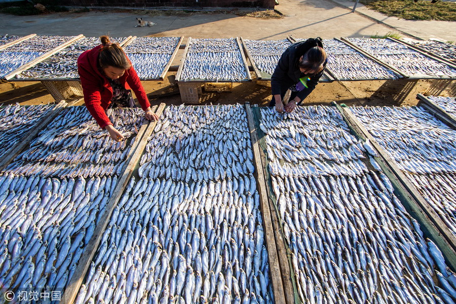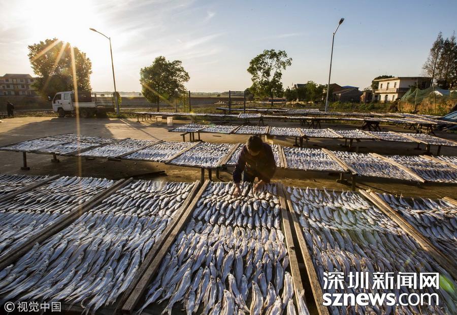 江西都昌縣薌溪鄉(xiāng)的漁民趁著晴好天氣翻曬捕撈上岸的魚(yú)蝦。