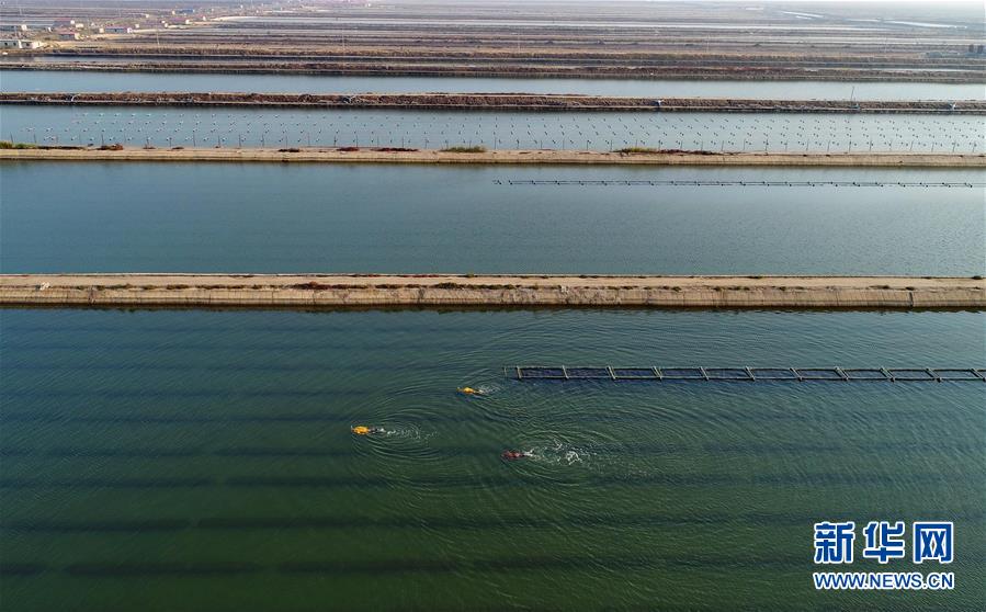 10月22日,樂(lè)亭縣姜各莊鎮(zhèn)二節(jié)村海參養(yǎng)殖基地的工人在捕撈海參(無(wú)人機(jī)拍攝)。 時(shí)下,正值渤海灣地區(qū)海參收獲時(shí)節(jié),河北省樂(lè)亭縣的海參養(yǎng)殖戶忙著捕撈海參,供應(yīng)各地市場(chǎng)。據(jù)介紹,該縣海域水質(zhì)優(yōu)良、氣候適宜,是海參養(yǎng)殖的理想場(chǎng)地,目前發(fā)展池塘造礁養(yǎng)殖海參面積6萬(wàn)畝,年產(chǎn)鮮活海參6000多噸,年產(chǎn)值2億多元。  新華社記者 楊世堯 攝