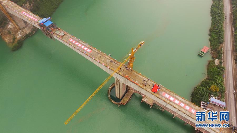 在重慶涪陵拍攝的渝懷鐵路涪秀二線重點(diǎn)工程——烏江右線大橋(10月23日無人機(jī)拍攝)。 10月23日,由中鐵四局承建的渝懷鐵路涪秀二線重點(diǎn)工程——烏江右線大橋主跨成功合龍,標(biāo)志著大橋主體工程全部順利結(jié)束。烏江右線大橋項(xiàng)目全程460.1米,主跨192米,跨越烏江和319國道。在兩年多的建設(shè)過程中,施工人員攻克了“不等高墩”“不對(duì)稱邊跨”“邊跨入隧”等多個(gè)技術(shù)難題。 新華社記者王全超攝