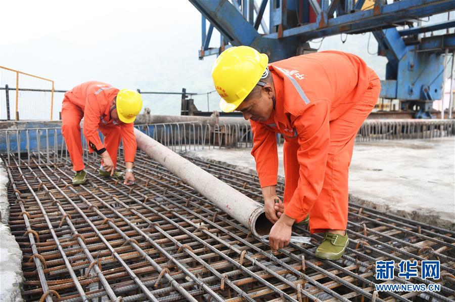10月23日,在重慶涪陵,施工人員在渝懷鐵路涪秀二線重點(diǎn)工程——烏江右線大橋主跨合龍現(xiàn)場(chǎng)作業(yè)。 當(dāng)日,由中鐵四局承建的渝懷鐵路涪秀二線重點(diǎn)工程——烏江右線大橋主跨成功合龍,標(biāo)志著大橋主體工程全部順利結(jié)束。烏江右線大橋項(xiàng)目全程460.1米,主跨192米,跨越烏江和319國道。在兩年多的建設(shè)過程中,施工人員攻克了“不等高墩”“不對(duì)稱邊跨”“邊跨入隧”等多個(gè)技術(shù)難題。 新華社記者王全超攝