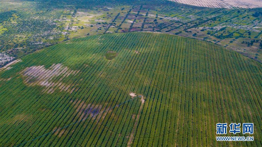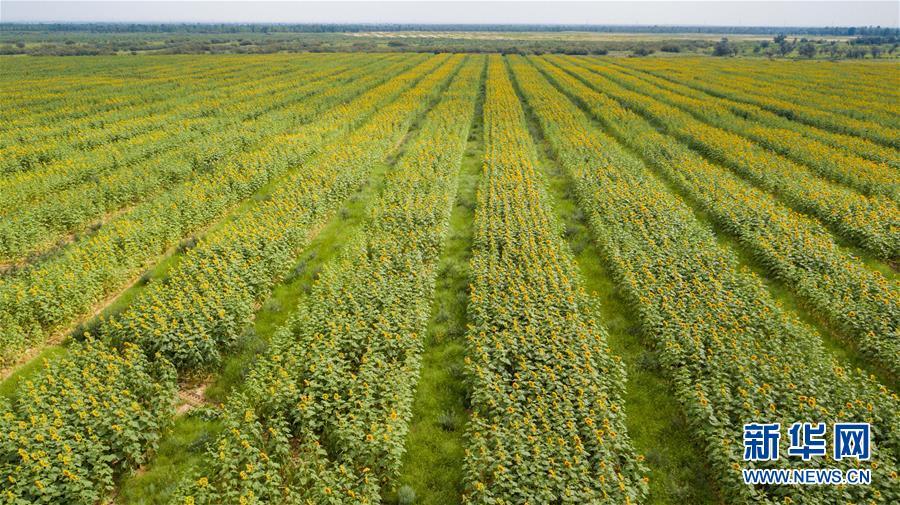 內(nèi)蒙古杭錦旗沙日召嘎查牧民白音道爾計種植的甘草等沙生植物(7月31日無人機(jī)拍攝)。 新華社記者劉磊攝