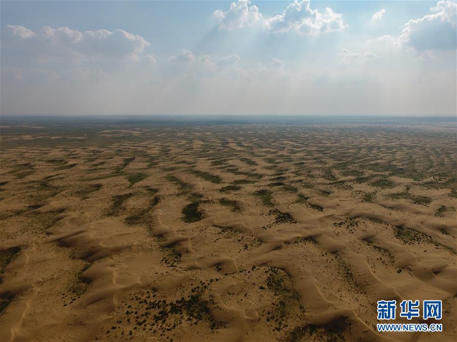 內(nèi)蒙古杭錦旗沙日召嘎查牧民白音道爾計治理過的庫布其沙漠(7月31日無人機(jī)拍攝)。 新華社記者邢廣利攝