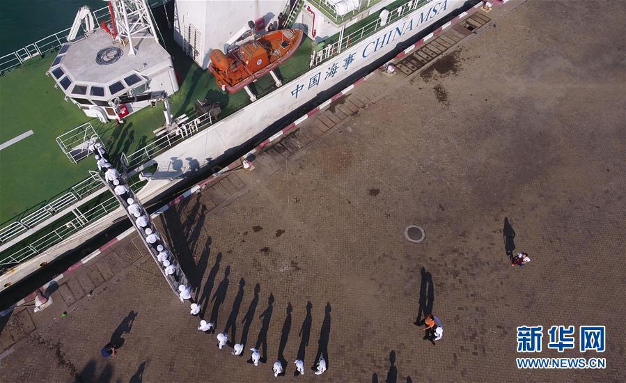 11月3日,海事執(zhí)法人員登上“海巡21”輪(無(wú)人機(jī)拍攝)。 當(dāng)日,隨著“海巡21”輪緩緩駛離海口海事監(jiān)管基地碼頭,由瓊桂粵海事部門(mén)共同開(kāi)展的瓊州海峽、北部灣及環(huán)海南島水域跨轄區(qū)聯(lián)合巡航執(zhí)法活動(dòng)揭開(kāi)序幕。 新華社記者楊冠宇攝