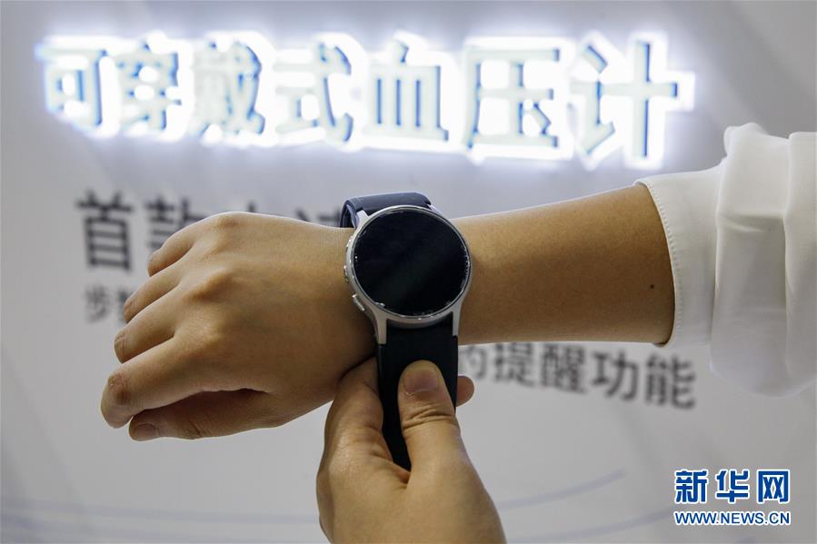 11月6日,日本歐姆龍公司工作人員在展示厚度僅25毫米的可穿戴式血壓計。 新華社記者 張玉薇 攝