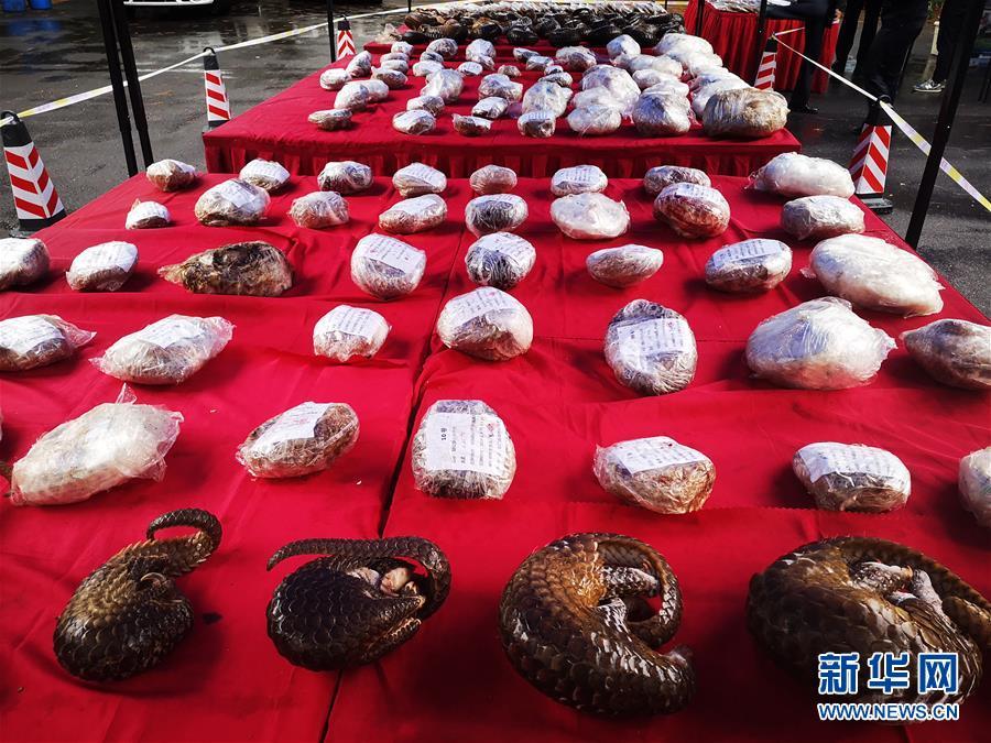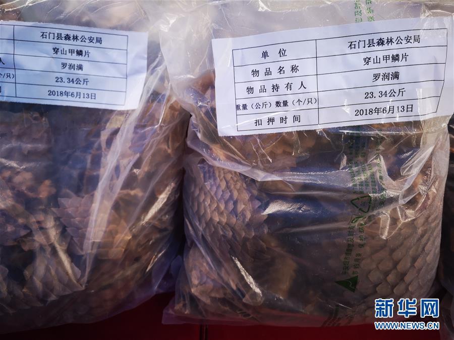 11月6日,湖南省林業(yè)局舉行“4.26”特大非法收購、運輸、出售珍貴、瀕危野生動物及其制品案發(fā)布會。據(jù)介紹,案件共刑事拘留犯罪嫌疑人129名,收繳穿山甲實體216只、穿山甲鱗片66公斤、藏羚羊角20只、其他野生動物及其制品一批,扣押贓款1800多萬元。抓捕行動一舉摧毀了一個由境外走私到廣西,由廣西運輸至廣州市,再由廣州市向全國分銷的穿山甲非法貿(mào)易網(wǎng)絡(luò)。新華社記者周勉攝