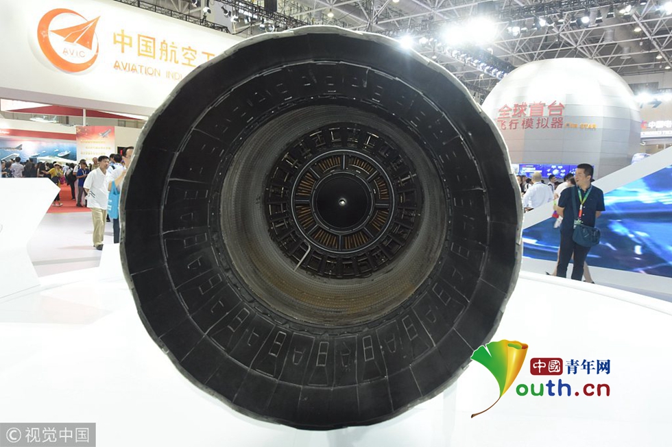 2018年11月7日,珠海航展上,觀眾在觀看國產(chǎn)新型渦扇發(fā)動機“太行發(fā)動機”。圖片作者:龍巍/視覺中國