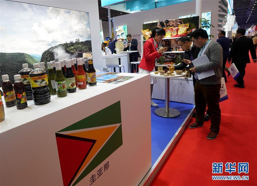 11月8日,在加勒比地區(qū)國(guó)家展區(qū)圭亞那展臺(tái),參觀者與工作人員交談。 中國(guó)國(guó)際進(jìn)口博覽會(huì)11月5日在上海開(kāi)幕。國(guó)家貿(mào)易投資綜合展(國(guó)家展)是中國(guó)國(guó)際進(jìn)口博覽會(huì)的重要內(nèi)容,共有82個(gè)國(guó)家、3個(gè)國(guó)際組織設(shè)立71個(gè)展臺(tái)。 新華社記者 程麗 攝