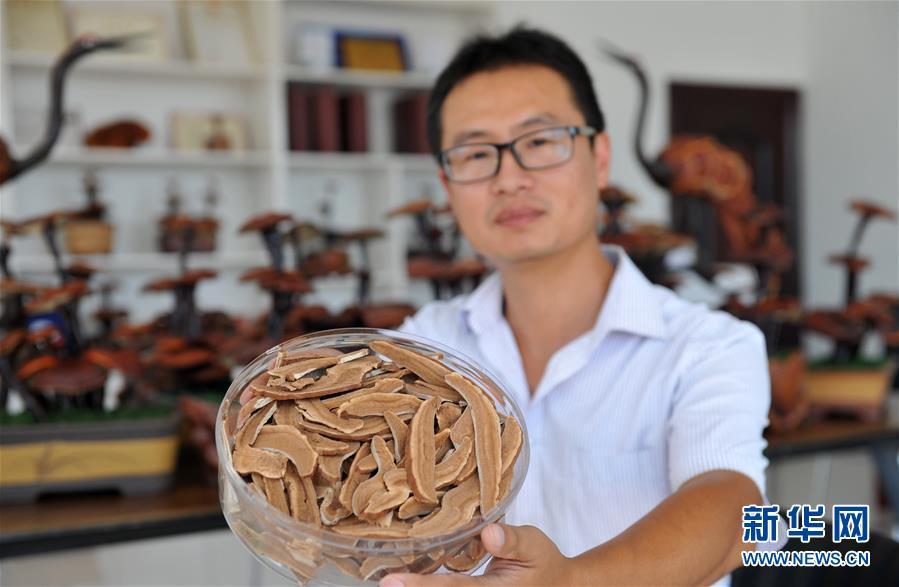 6月20日,廣宗縣大柏社村村民王志恒在展示制作的靈芝盆景。 近年來(lái),河北省廣宗縣大柏社村積極引導(dǎo)農(nóng)民結(jié)合市場(chǎng)需求調(diào)整農(nóng)業(yè)產(chǎn)業(yè)結(jié)構(gòu),采取“公司+合作社+基地+農(nóng)戶”的經(jīng)營(yíng)模式,發(fā)展特色靈芝種植,并開發(fā)出靈芝盆景、靈芝孢子粉等相關(guān)衍生產(chǎn)品,開辟出一條富農(nóng)創(chuàng)收新路徑。目前,大柏社村靈芝種植面積近百畝,種植各類靈芝5000余株,帶動(dòng)120余名農(nóng)民就業(yè)增收。新華社記者朱旭東攝