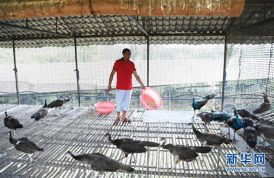 5月16日,在重慶市銅梁區(qū)永嘉鎮(zhèn)高龍村,閻仁兵在養(yǎng)殖場(chǎng)內(nèi)給藍(lán)孔雀喂食。新華社記者 王全超 攝
