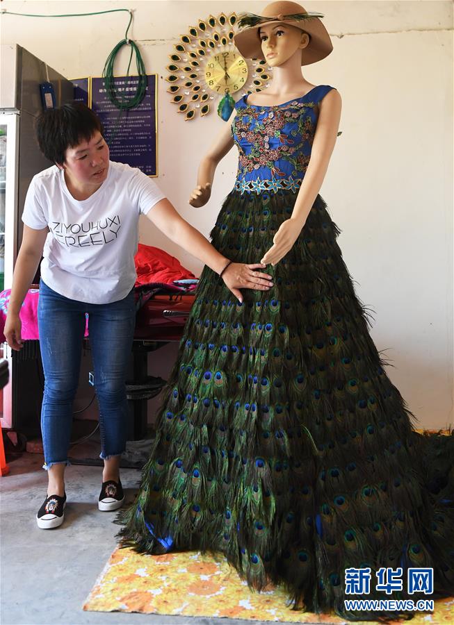 5月16日,在重慶市銅梁區(qū)永嘉鎮(zhèn)高龍村,張榮蘋(píng)在整理一件孔雀羽毛服裝。 新華社記者 王全超 攝