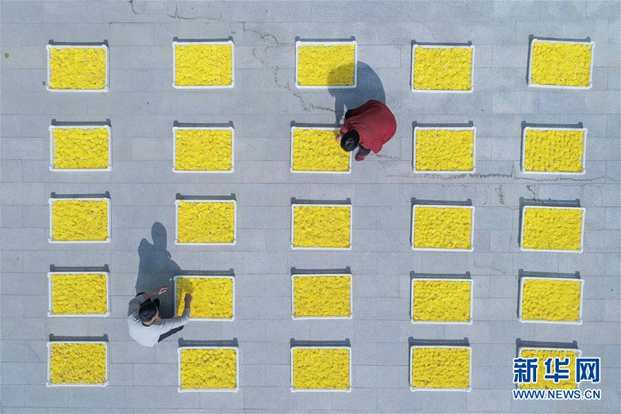 10月30日,武安市午汲鎮(zhèn)東河下村村民在晾曬菊花。 新華社記者 王曉 攝