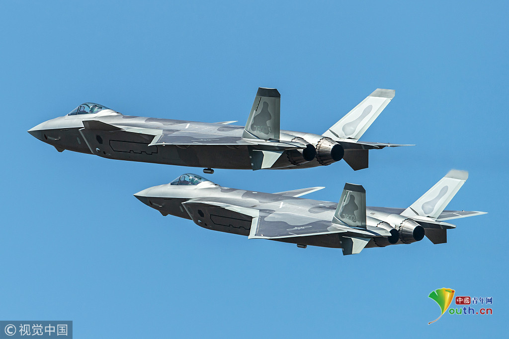 圖五:2018年11月6日,廣東珠海航展上,兩架殲-20戰(zhàn)機(jī)組成雙機(jī)編隊(duì)進(jìn)行飛行表演。