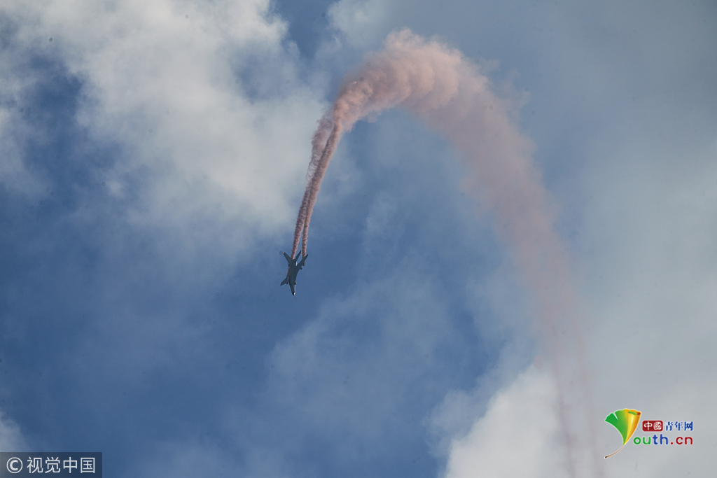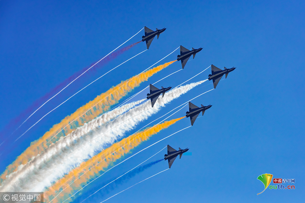 2018年11月8日,廣東珠海,第十二屆中國(guó)國(guó)際航展第三天??哲姟鞍艘弧憋w行表演隊(duì)的隊(duì)員們,發(fā)揚(yáng)連續(xù)作戰(zhàn)精神,給觀眾們表演了七機(jī)分組開花、四機(jī)編隊(duì)橫滾等高難動(dòng)作,受到觀眾們的稱贊。視覺中國(guó)