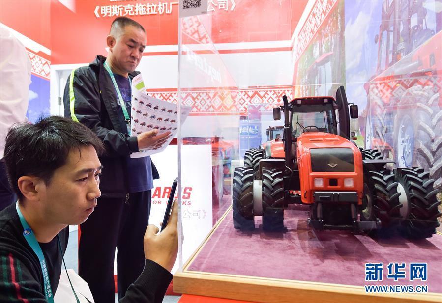 11月7日,參觀者在拍攝、觀看白俄羅斯明斯克拖拉機(jī)廠的拖拉機(jī)模型。 新華社記者 李賀 攝