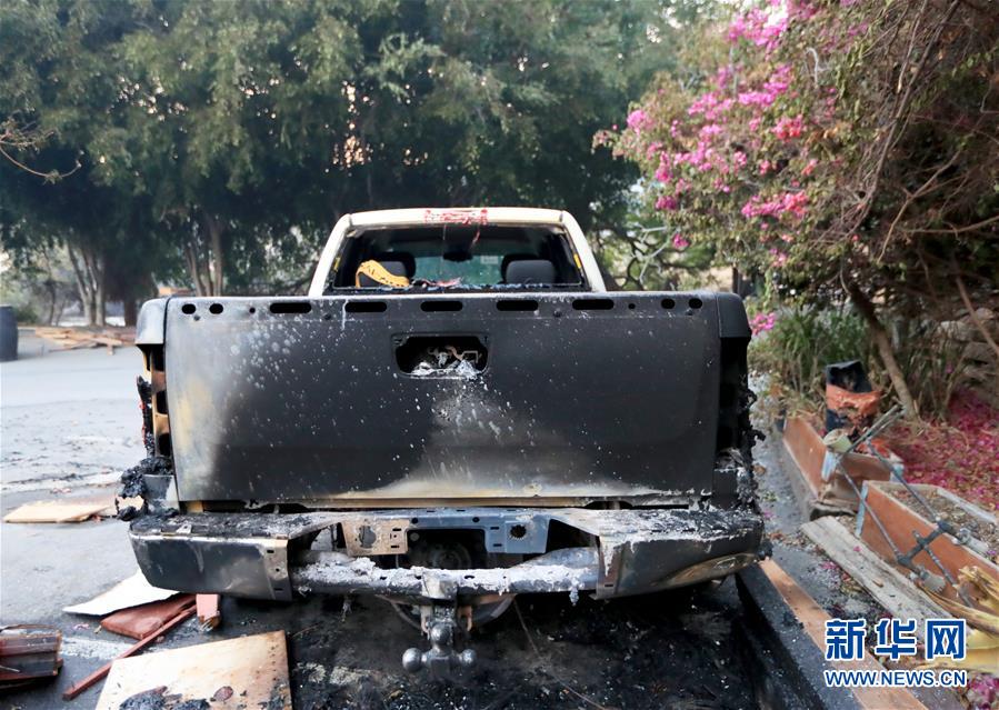 這是11月10日在美國(guó)加利福尼亞州馬里布市拍攝的一輛被燒毀的汽車(chē)。連日來(lái),美國(guó)加利福尼亞州野火肆虐。 新華社記者李穎攝