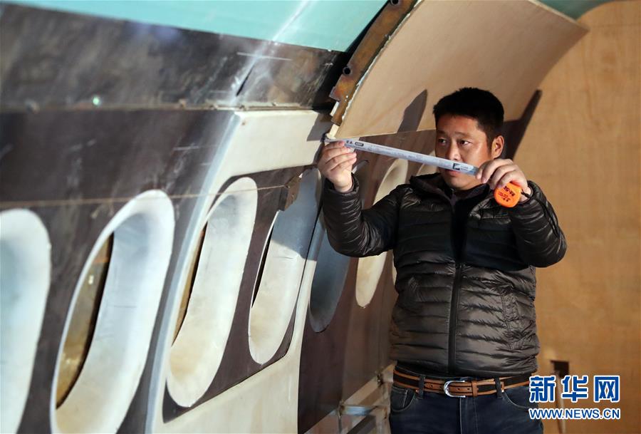 11月10日,在遼寧開原老城街道前三臺(tái)子村,朱躍在“飛機(jī)”內(nèi)部測量安裝尺寸。 新華社記者 楊青 攝