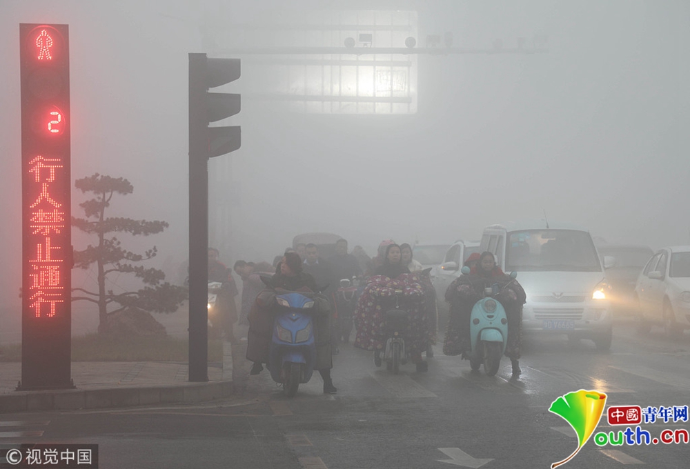 2018年11月12日,河南平頂山寶豐縣出現(xiàn)大霧, 街頭汽車打開霧燈,行人小心行走。