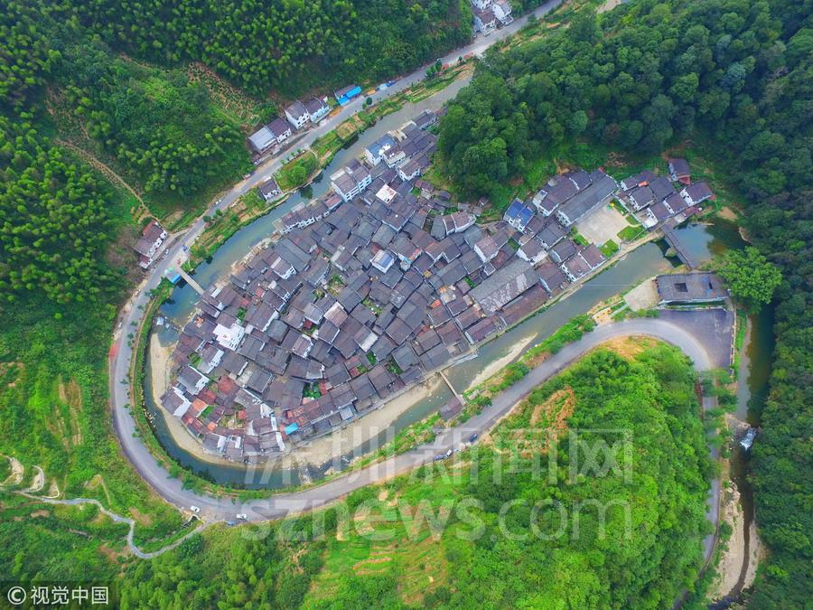 小河呈大半圓形,繞村莊將近一周,四周高山環(huán)繞,新修的柏油公路沿著河流呈圓弧形繞村而過,一些木板橋與公路相連。