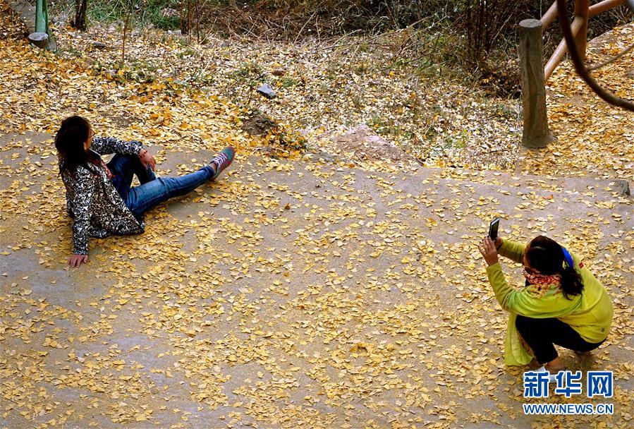 11月1日,游客在河南省嵩縣白河鄉(xiāng)下寺村古銀杏樹下拍照賞景。 深秋時節(jié),河南省嵩縣白河鄉(xiāng)下寺村的古銀杏林為小山村披上了“金甲”。漫天黃葉,遍地金色,一幢幢民居掩映在色彩斑斕的世界里,美不勝收,吸引了眾多游客賞景拍照。 新華社記者 李安 攝
