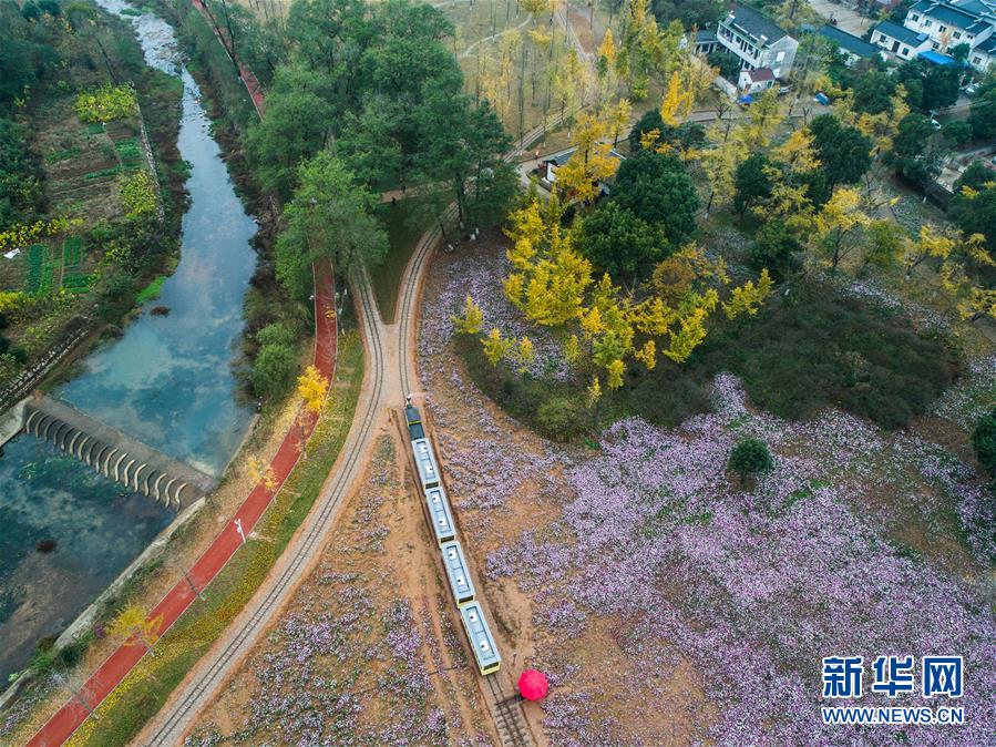 一列觀光小火車帶著游客穿行在銀杏林和花海之間(11月16日無人機(jī)拍攝)。近日,在浙江省長(zhǎng)興縣小浦鎮(zhèn),“十里銀杏長(zhǎng)廊”和近千畝花海經(jīng)過近一年的升級(jí)改造后,以嶄新的面貌與游客見面。花海、觀光小火車、古村民宿、銀杏長(zhǎng)廊等旅游項(xiàng)目全面提升了小浦鎮(zhèn)鄉(xiāng)村旅游的品質(zhì)。新華社記者 徐昱 攝