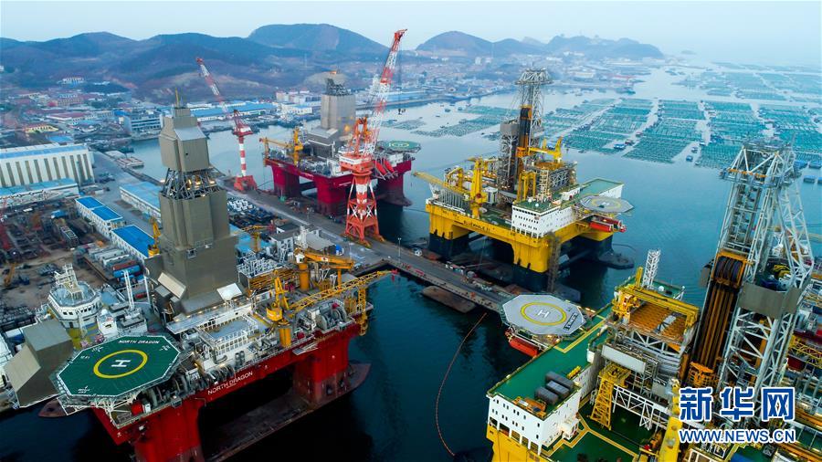 中集來福士海洋工程有限公司煙臺基地深水碼頭停放的半潛式鉆井平臺(11月14日無人機航拍)。新華社發(fā)(張丞攝)