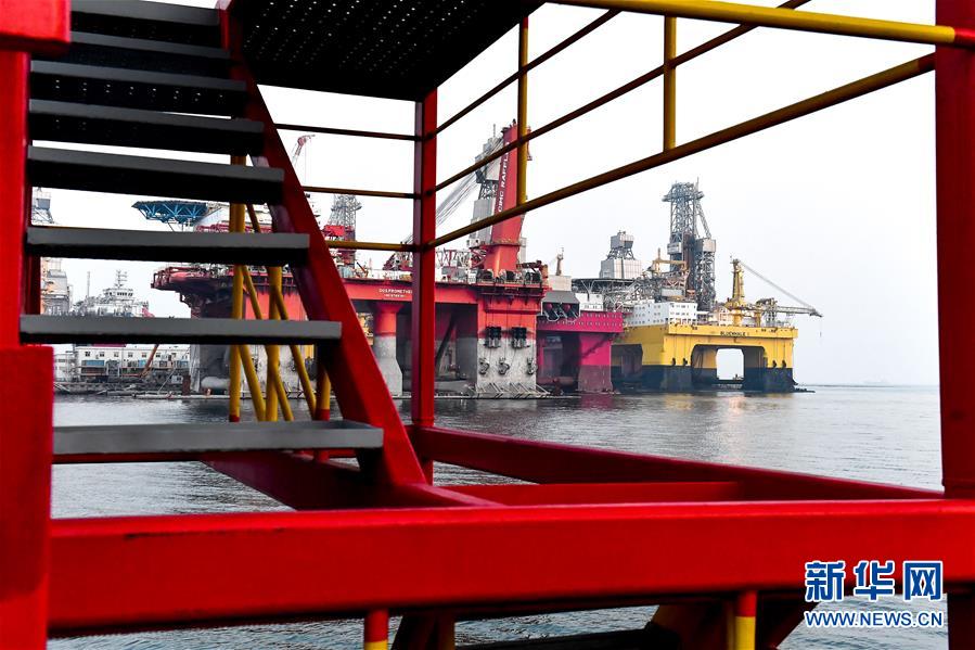 中集來(lái)福士海洋工程有限公司煙臺(tái)基地深水碼頭停放的半潛式鉆井平臺(tái)(11月14日攝)。新華社記者郭緒雷攝