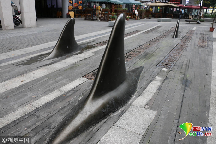 2018年11月20日,重慶一園區(qū)內(nèi)馬路中間突出一排“鯊魚鰭”,司機路人都被“嚇懵”了。突出的鯊魚鰭將兩側(cè)的車行道分開,原來,這是為了進一步保證車流的有序進出和行人過街安全,同時也為了防止亂停車占用人行道,設置了這種異形“隔離樁”。圖片來源:視覺中國