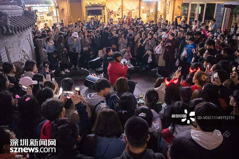 2018年4月6日晚,清明小長假的第二天,在山東省濟(jì)南市復(fù)古老街區(qū)寬厚里,暫停演出有段時日的網(wǎng)紅歌唱組合“連音社”悄然復(fù)出,吸引了當(dāng)?shù)匾约皝碜匀珖鞯赜慰偷膰^。