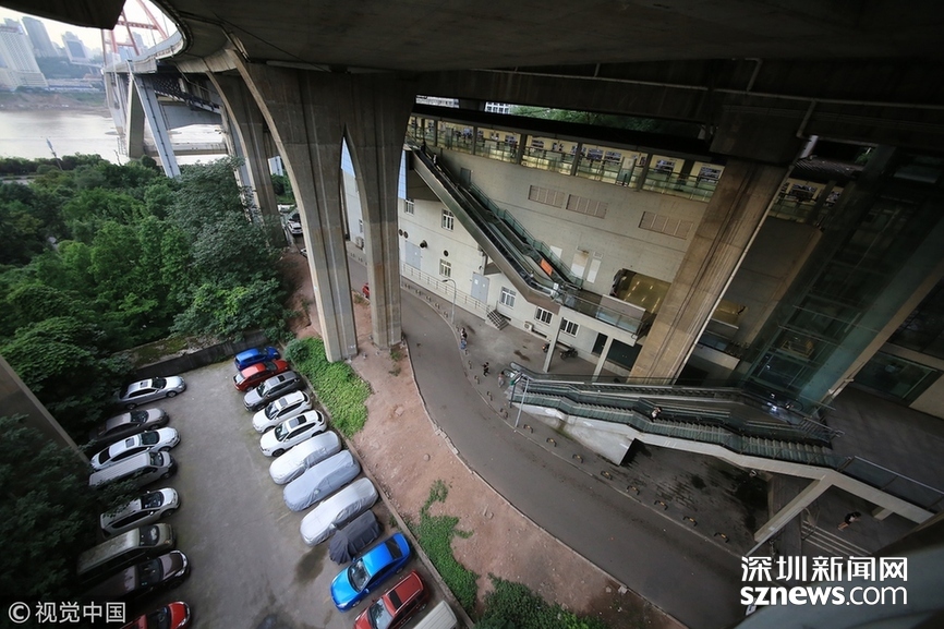 2018年5月29日,重慶,魔幻重慶又雙叒叕放大招!還有一個(gè)獨(dú)特的亮點(diǎn),重慶軌道交通3號(hào)線銅元局站,出口由一段長梯銜接上方立交橋和下方的路面,與全國最高城市立交橋蘇家壩立交組成了獨(dú)特風(fēng)景,許多游客專門趕來拍照。