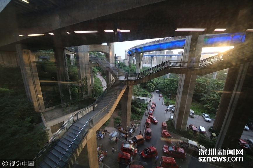 2018年5月29日,重慶,魔幻重慶又雙叒叕放大招!還有一個(gè)獨(dú)特的亮點(diǎn),重慶軌道交通3號(hào)線銅元局站,出口由一段長(zhǎng)梯銜接上方立交橋和下方的路面,與全國(guó)最高城市立交橋蘇家壩立交組成了獨(dú)特風(fēng)景,許多游客專門趕來(lái)拍照。