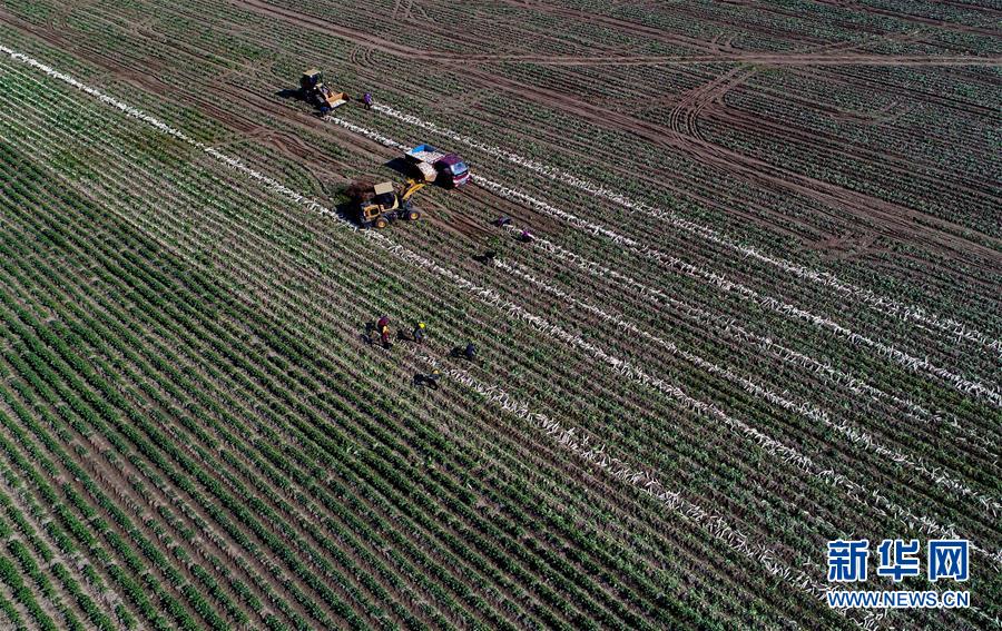 黃驊市常郭鎮(zhèn)一種植專業(yè)合作社社員在收獲白蘿卜(11月19日無(wú)人機(jī)拍攝)。 新華社記者 楊世堯 攝