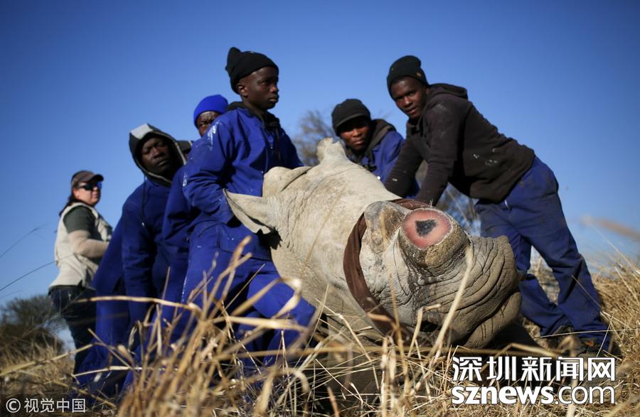 當(dāng)?shù)貢r(shí)間2017年8月14日,南非西北省,一名工作人員在為一頭犀牛鋸角,這是一種保護(hù)犀牛的行為,可以防止它們喪命于偷獵者的槍口下。