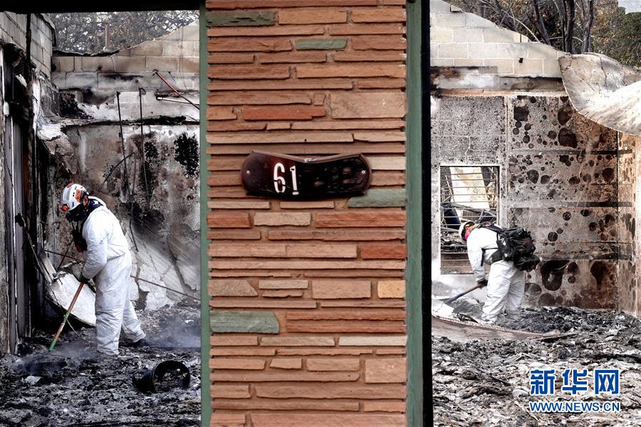 11月20日,在美國加利福尼亞州比尤特縣天堂鎮(zhèn),救援人員在山火廢墟中工作。