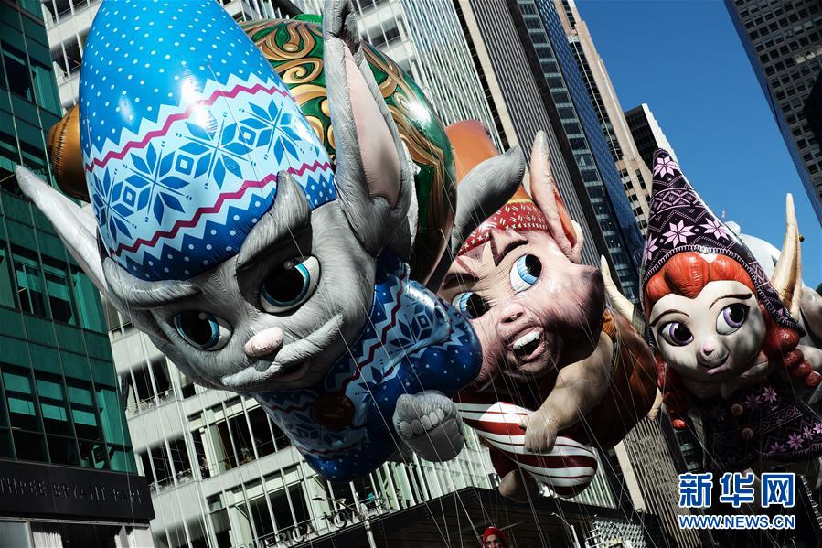 11月22日,在美國紐約感恩節(jié)大游行上,小精靈造型氣球行進(jìn)在曼哈頓街頭。