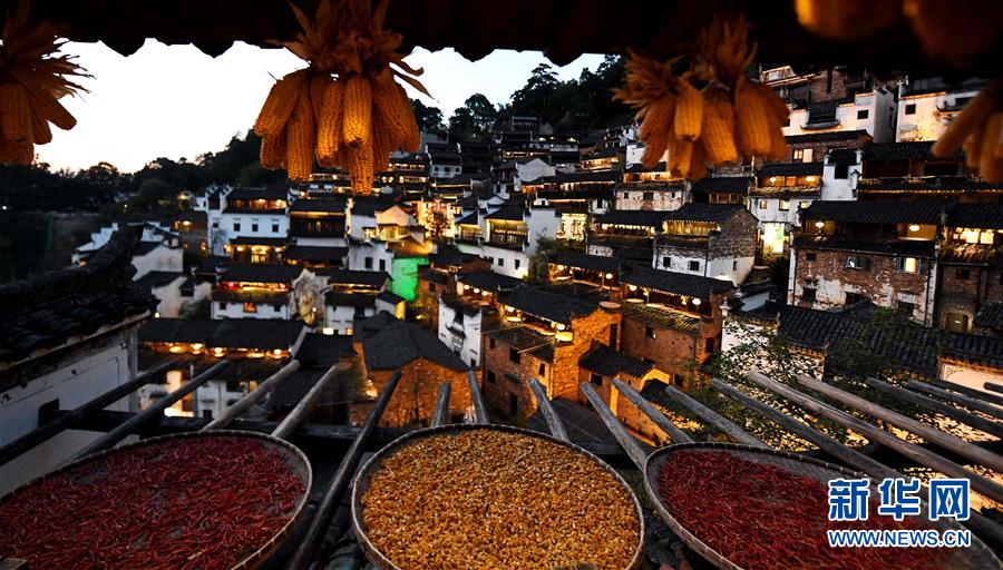 這是黃昏中的篁嶺古村(10月25日攝)。近日天氣晴朗,江西省婺源縣江灣鎮(zhèn)篁嶺村村民抓住時(shí)機(jī)采摘、晾曬皇菊及蔬果。明黃的菊花、火紅的辣椒……各種顏色將篁嶺古村裝扮成巨大的“調(diào)色板”,引來眾多游客感受鄉(xiāng)村美景。新華社記者宋振平 攝