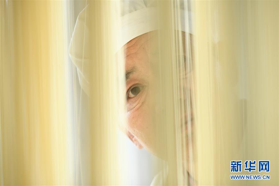 11月23日,在石家莊市藁城區(qū)耿家莊村某宮面生產(chǎn)廠,藁城宮面制作技藝代表性傳承人董根川查看宮面風(fēng)干情況。