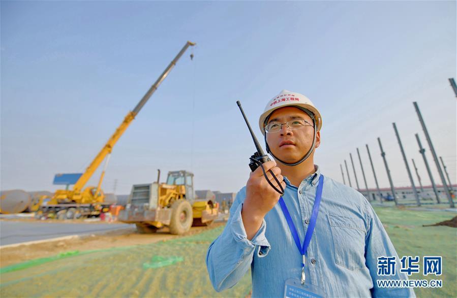 4月26日,來(lái)自中鐵上海工程局京雄城際鐵路五標(biāo)二分部的工程師韓正順在京雄城際鐵路工程五標(biāo)段小型構(gòu)件預(yù)制廠(chǎng)場(chǎng)地建設(shè)現(xiàn)場(chǎng)用對(duì)講機(jī)指揮作業(yè)。新華社記者王曉 攝 圖片來(lái)源:新華網(wǎng)