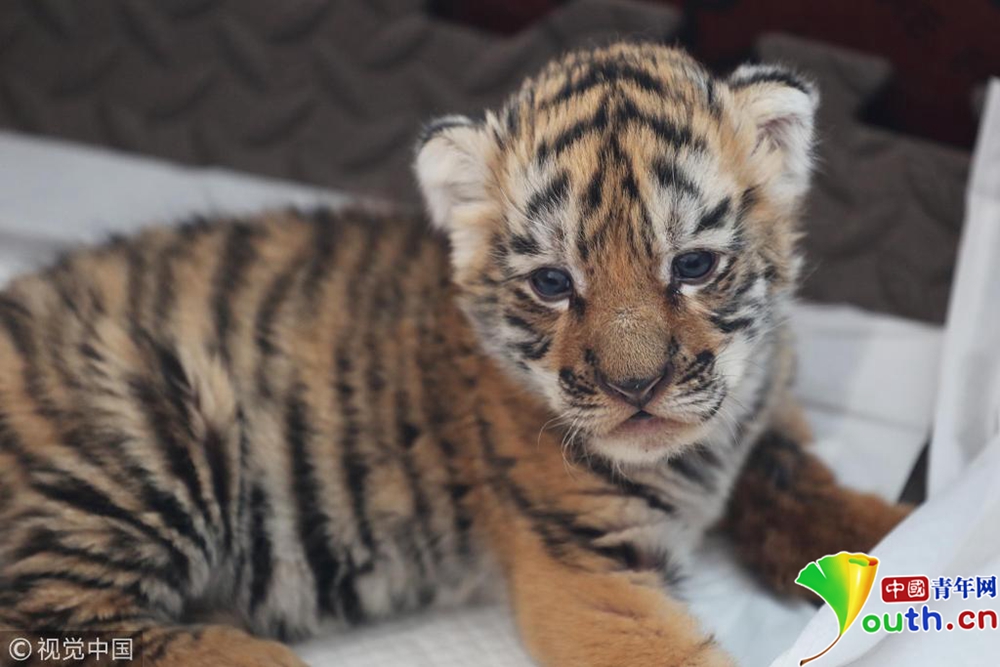 一只剛出生不到一個月的小東北虎寶寶。