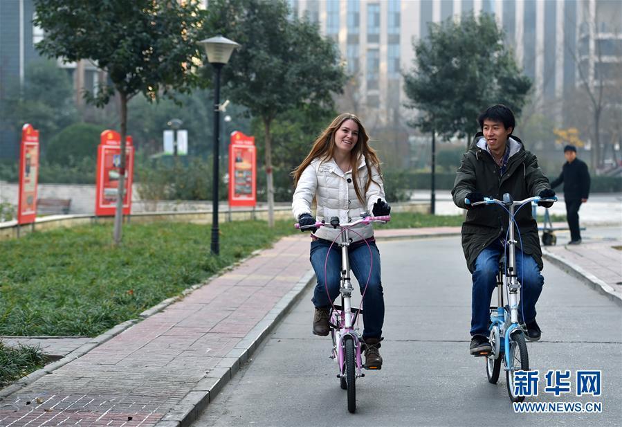 11月24日,艾米莉和愛人郭了達一起騎車出行。 新華社發(fā)(張曉峰 攝)