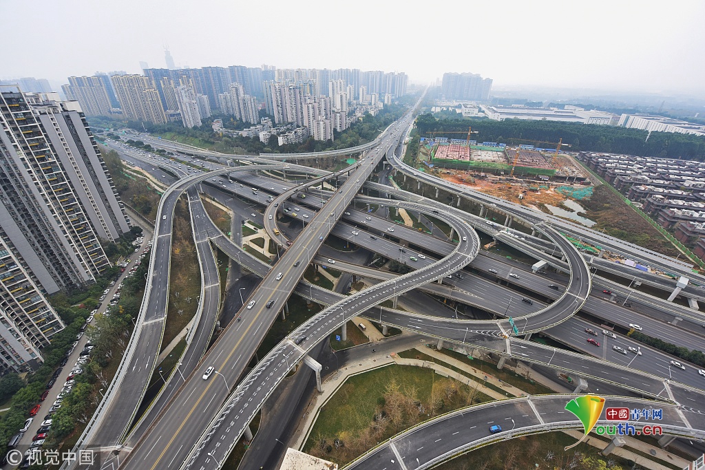 2018年11月23日,成都,俯瞰整個(gè)嬌子立交的全貌:12條匝道已經(jīng)完工,道路標(biāo)線(xiàn)、路面路況、指示牌都是全新的,不時(shí)有車(chē)輛在三環(huán)路和成龍路之間轉(zhuǎn)換。