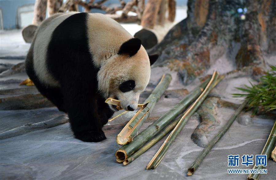 11月25日,大熊貓“舜舜”在海南熱帶野生動植物園熊貓館吃竹子。新華社記者 郭程 攝