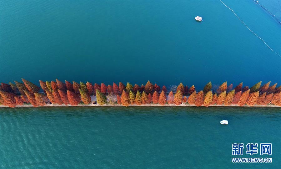 兩只小船行駛在湖南烈士公園年嘉湖湖面(11月25日無人機拍攝)。新華社記者 李尕攝
