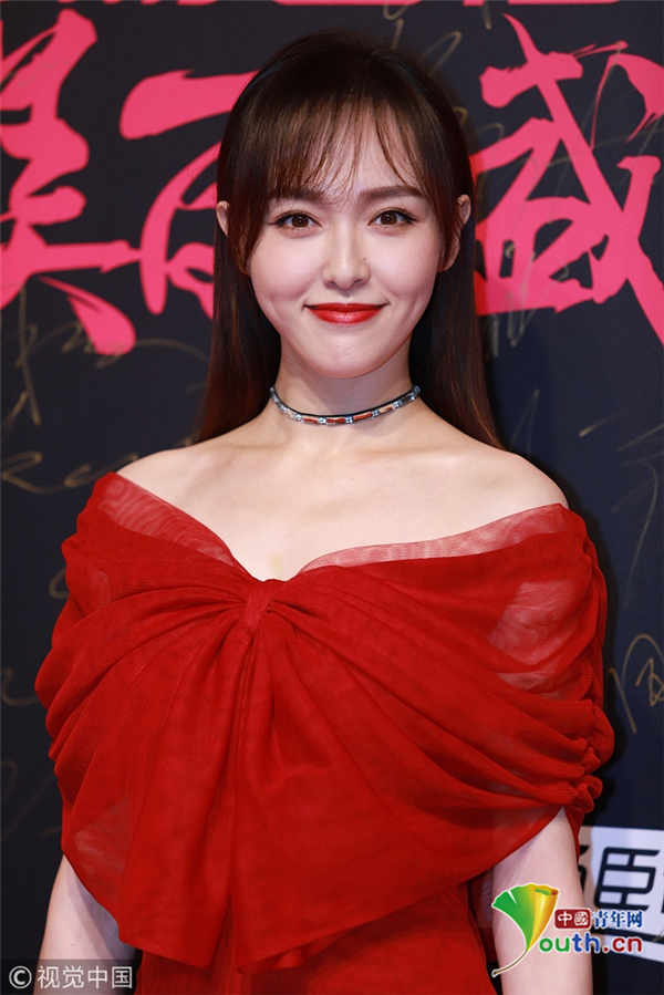 唐嫣紅色紗裙知性溫婉 胸前蝴蝶結(jié)點 ...