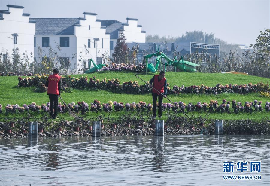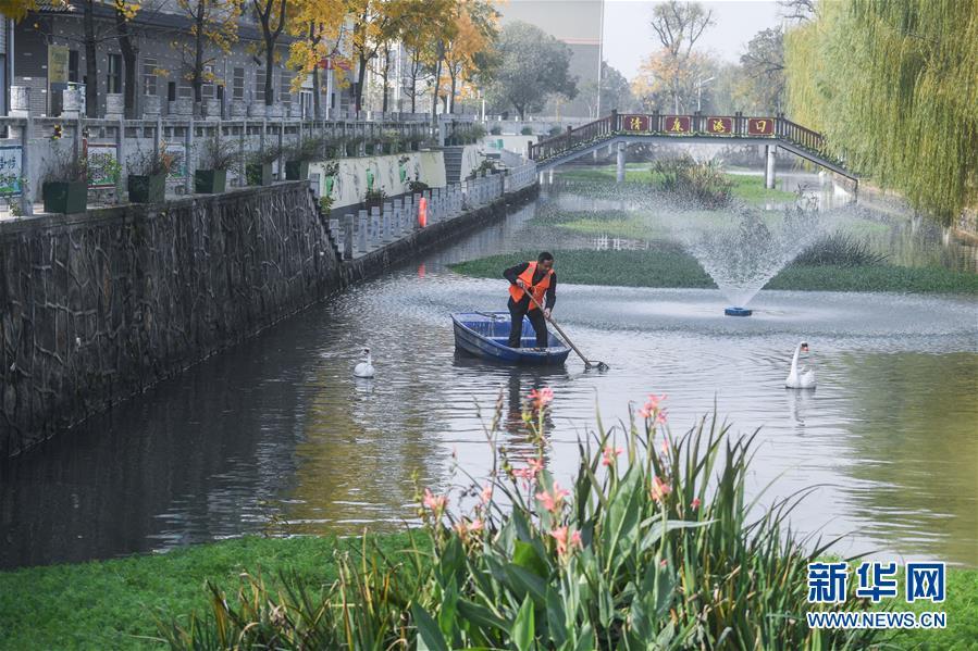 11月28日,林城鎮(zhèn)北湯村河長黃雙喜(右)在施家邊河打撈水面漂浮物。近年來,北湯村全面推進“五水共治”,停止河道內(nèi)的水產(chǎn)養(yǎng)殖,并進行河道清淤,整治周邊環(huán)境,另外還結(jié)合北湯生態(tài)園旅游項目,發(fā)展旅游經(jīng)濟,打造水上娛樂設(shè)施?,F(xiàn)在北湯村施家邊河道水質(zhì)清澈,環(huán)境秀美,每年為北湯村吸引游客18萬人次。 新華社記者 徐昱 攝