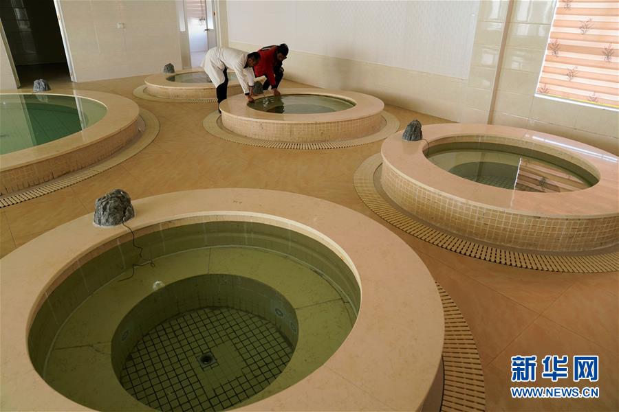 西藏自治區(qū)藏醫(yī)院風濕病防治研究羊八井基地工作人員在查看藥浴池子(2018年11月21日攝)。新華社記者普布扎西攝